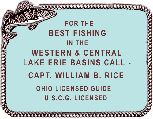 Call - Capt. William B. Rice Phone 419-635-2068 or E-mail: RiceCharters@adelphia.net 28 Foot "Friendly Mission" Located at Wild Wings Marina USCG Licensed * Ohio Licensed Guide Member - P.C. Chamber of Commerce * LECBA * NACO Rice Charters * 6206 W. Harbor Rd. * Port Clinton, Ohio 43452
