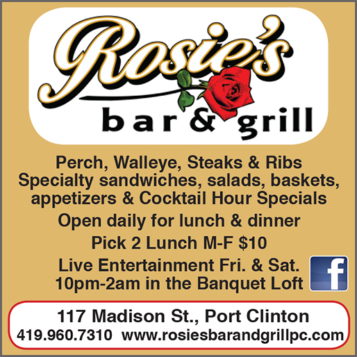 Downtown dining on Madison Street in Port Clinton. Perch, walleye, steaks and ribs are specialties. Open daily for lunch and dinner. Located at 117 Madison Street and phone 419-960-7588. https://www.rosiesbarandgrillpc.com |