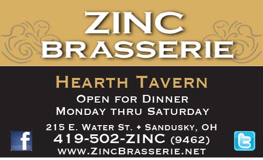 | Dining at it's finest in downtown Sandusky, enjoy the Zinc Brasserie or Hearth Tavern. Open for Dinner Monday through Friday at 215 East Water Street. Phone 419-502-9462 or check out www.ZincBrasserie.net, Facebook or Twitter. |